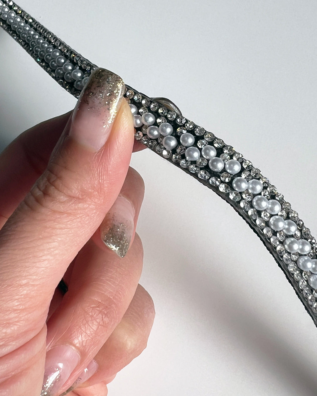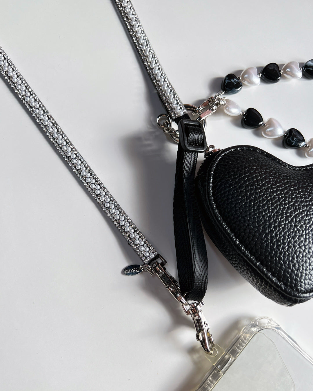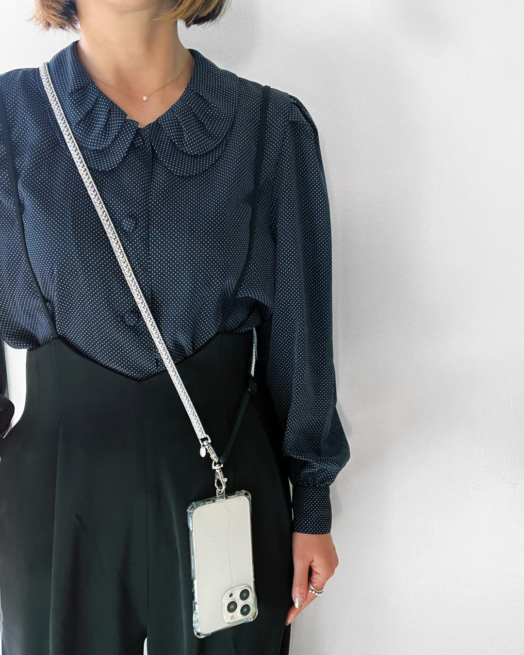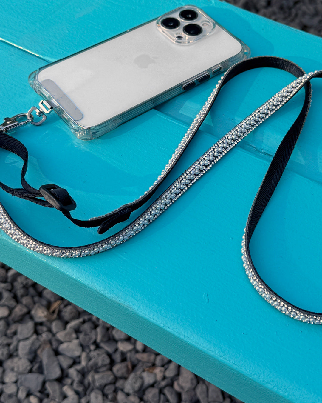パールビジューがキラキラと輝くスマートフォン用ショルダーストラップ。